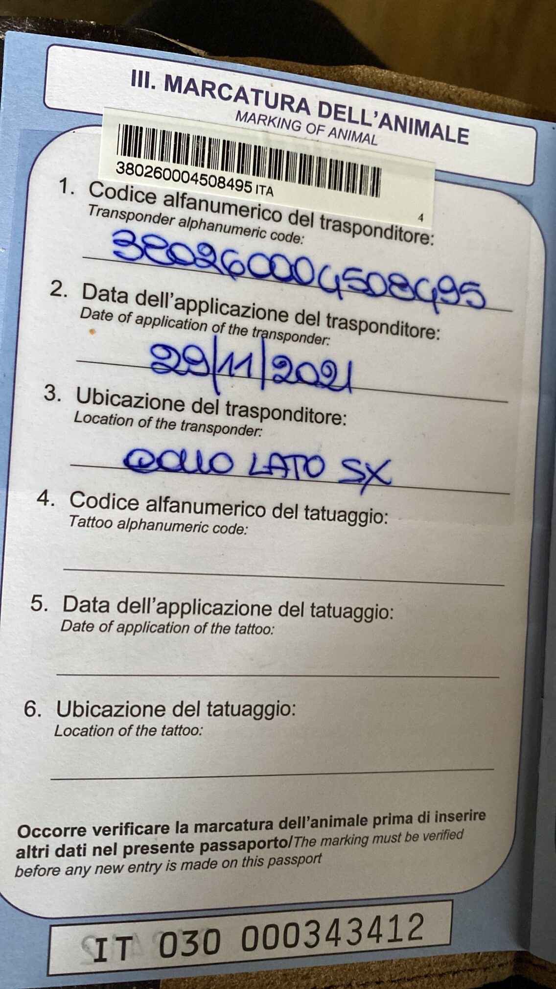 Allego foto del cane e del numero del microchip